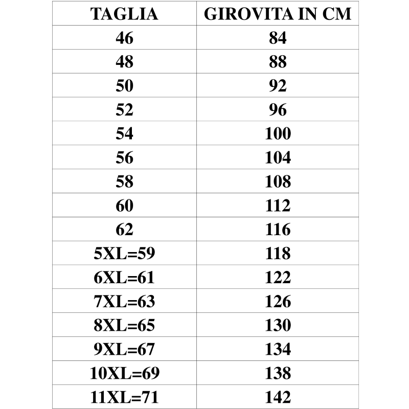 è disponibile dalla taglia 46 alla 62 nelle taglie regolari e dalla 59 alla 71 nelle taglie calibrate