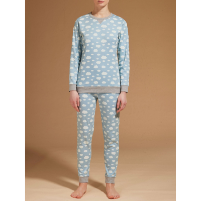 Pigiama lungo in interlock di puro cotone con stampa nuvole composto da maglia girocollo e pantalone con polsino alla caviglia.